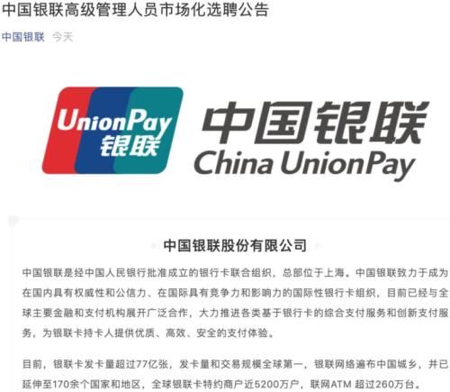 银联全球公开招聘5名副总裁 将有哪些新布局?